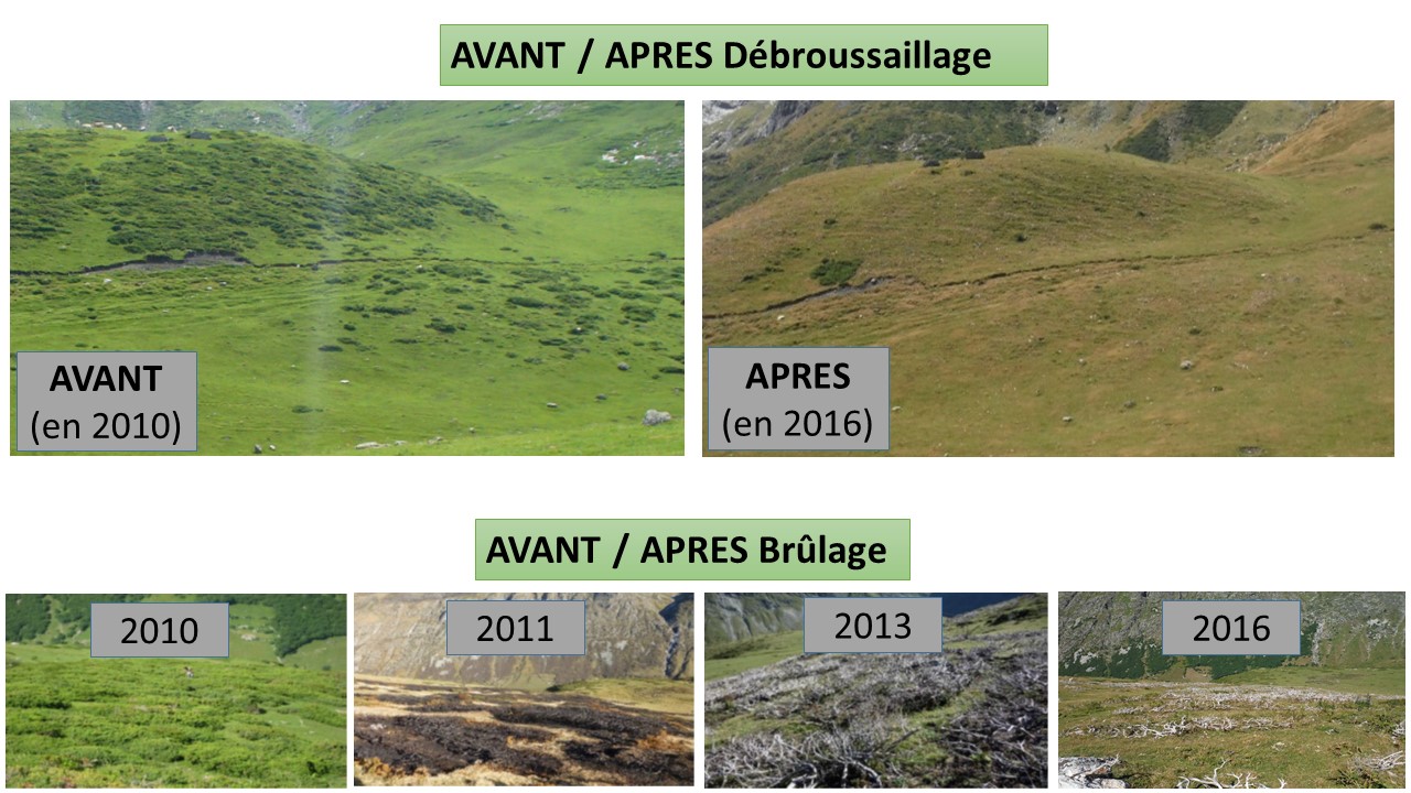 Aujourd’hui, une dynamique d’embroussaillement par le genévrier des estives est en place. Une expérimentation est menée pour pouvoir comparer deux méthodes de réouverture, le broyage et le brûlage, sur les plans pastoral, de la conservation des milieux (habitats de pelouses et enjeux cynégétiques), financier et paysager. Les facteurs de variation de l’étude sont :