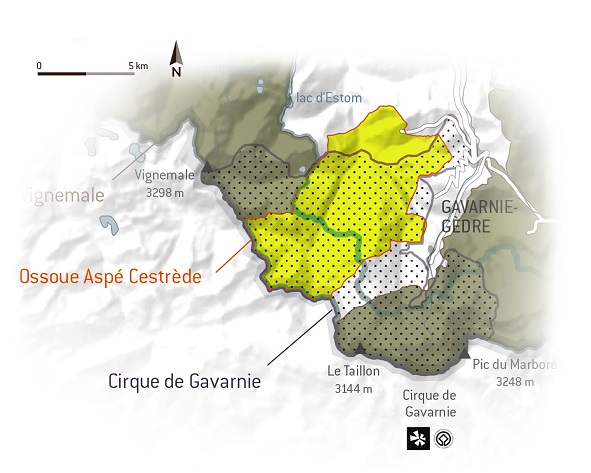 Les 5600 ha du site se répartissent de 1490 mètres d'altitude dans la partie la plus basse (au niveau des granges de Bué) à 2968 mètres au niveau du Soum d’Aspé situé sur la crête séparant les deux vallées de Luz et de Cauterets. Les vallons d’Ossoue, d’Aspé et de Cestrède, qui composent l’ensemble du site Natura 2000, sont drainés chacun par un gave portant leur nom, qui s’écoule d’Ouest en Est et se jette dans le gave de Pau.