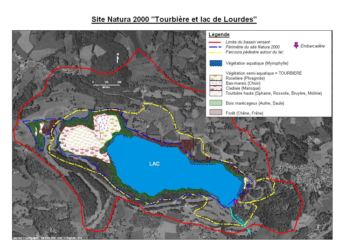 Le site Natura 2000 "Tourbière et lac de Lourdes" se situe dans le Piémont Pyrénéen à la limite ouest du département des Hautes-Pyrénées, à moins d’un kilomètre du Gave de Pau. Il s’agit d’une petite vallée encaissée entourée des chaînons de Saint Pé Pibeste, dont le bassin versant alimente le Lac de Lourdes en fond de vallée. Ce site couvre une surface de 86 ha, dont un lac d’origine glaciaire (44,8 ha), seul lac de basse altitude (424 m) dans cette région des Pyrénées. Deux communes sont concernées par le périmètre du site : Lourdes et Poueyferré.